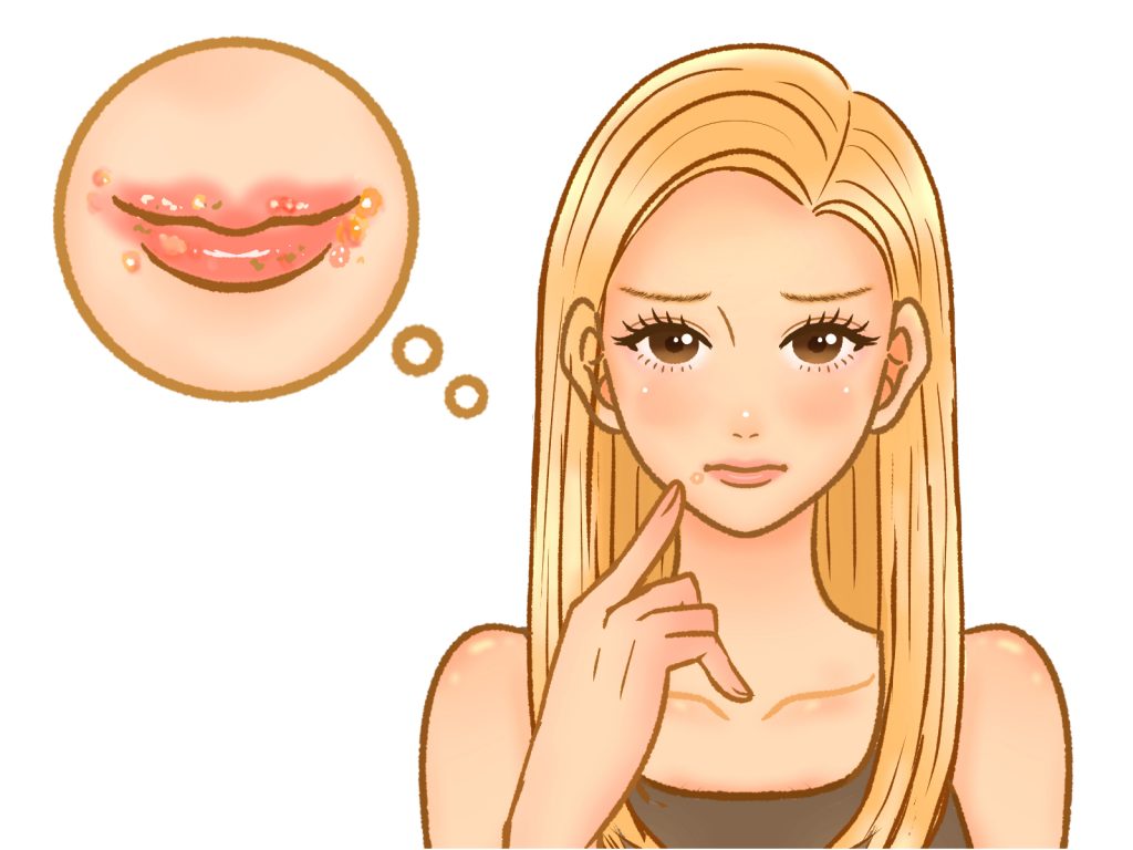 口唇ヘルペスとは、単純ヘルペスウイルス(HSV-1)というウイルスに感染することによって、唇やその周囲に痛みを伴う水ぶくれができる病気です。